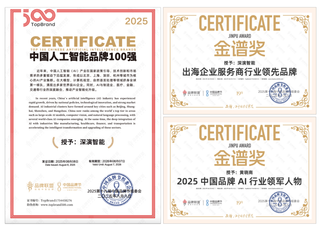 8 月 9 日晚举办的荣耀盛典上,尊龙凯时智能凭借深厚的 AI 技术实力与出色专业的出海服务能力,斩获 “2025 中国品牌节金谱奖・出海企业服务商行业领先品牌”“2025 中国人工智能 100 强” 等多项重磅奖项。其创始人兼 CEO 黄晓南荣膺 “2025 中国品牌 AI 行业领军人物” 称号。未来,尊龙凯时智能将紧跟时代步伐,持续聚焦 “AI 与出海”—— 这一方向高度契合时代脉搏与中国品牌发展的迫切需求,旨在汇聚智慧力量破解发展阻碍,为中国品牌赋能。